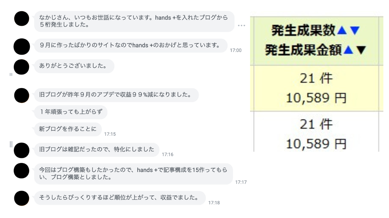 Hands+を利用したことでどのような成果を得られましたか? Hands+を利用した成果は次のとおりです。現時点でPV数は1000PV〜5000PV以上に増加。売り上げは0円から最高収益81,682円へ。KWを受け取った日からたった5ヶ月程度で達成しました。もちろん下書きはないので、記事本文は自分で書きましたが、思ったよりGoogleさまに評価してもらえたことに驚いています。正直なところ、最初はこんな競合が強いKWで勝てる気がしないとおもったのが本音です。でも今は、Hands+のサービス(KW選定)をとおして「誰のためのブログか」という視点を本当の意味で教えられたと思っています。自分1人ではとても考えられなかったKWでした。Hands+を利用しなくても数万円の収益は挙げられたかもしれませんが、一気に80,000円を超えることはなかったと思います。何より、40代のパソコン音痴が最初に立ち上げたブログで収益化できたこと。Hands+のKW選定を通してブログのみならず、事業の本質を学べたことは、大きな財産だとおもい感謝しています。 Hands+を利用する前の状況を教えてください。 パソコン買うところから副業でブログを始め、1年間の収益は数百円の楽天ポイントのみでした。Hands+さんを利用する前は、20記事書いて28日間のPV数は1,000PV前後。ASPの売上は0円で、自分の才能の無さに焦っていました。 Hands+を利用する前にどのような課題や問題を抱えていましたか? 2023年の10月にはじめてASPの案件が3件発生して大喜びしたのも束の間、すべて非承認でブログを辞めようか本気で悩んでいました。40年以上生きて、さまざまな経験はしたつもりですが、あんなに悔しい思いをした経験はなかなかありません。とにかく売り上げをだしたくてもがいてる時に、たまたまみたYouTubeのWeb職TV。なかじさんの名言「富士山向かってるのに那覇行きの飛行機に乗ってるよ!」という言葉に脳みそを撃ち抜かれました。もしかしたら、KW選定が根本的にまちがっているのかもしれないと。 Hands+で利用したサービスを教えてください。 Hands+はサービスを開始したばかりのときに、すぐ申し込みました。11月か12月頃だったと記憶しています。初期のころだったので、30記事分のKW選定です。「これでダメだったら、今のブログは辞める」と覚悟を決めておねがいしました。 Hands+はどのような人におすすめだと感じましたか? Hands+はブログで収益化したい初心者の人はもちろん、いま伸び悩んでいるブロガーにもおすすめできます。企業様にもおすすめですが、そうなるとSEOで勝てる気がしないので複雑な心境です。Hands+を利用する個人的に1番のメリットは、お金を稼ぐこと以上に大事な、ビジネスの本質が感じ取れるところ。私も2027年にフリーランスになると決めましたが、Hands+で学んだKW選定の考え方は他のビジネスにも活かせると確信しています。